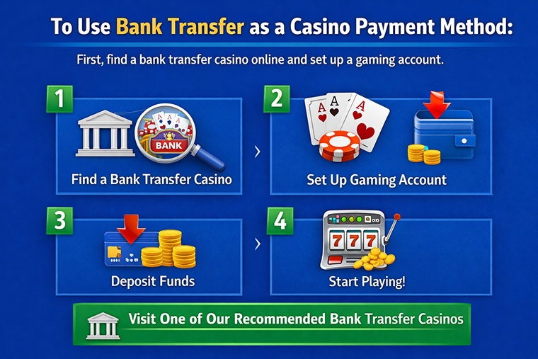 To use bank transfer as a casino payment method, you must first find a bank transfer casino online and set up a gaming account. You can sign up at one of the bank transfer casinos we recommend.