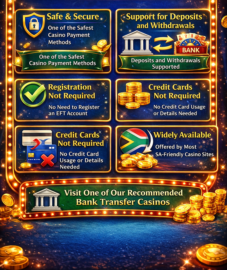 - Registration Not Required: You needn’t register an account with any third party to use EFT as a casino payment method. You only have to choose bank transfer/EFT as your casino payment method and provide your bank account details to initiate the transaction.
