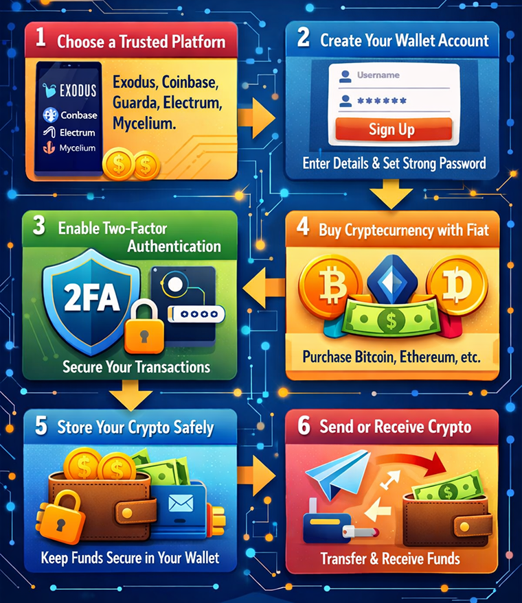 - Set up a wallet by providing the required details and creating a strong password.